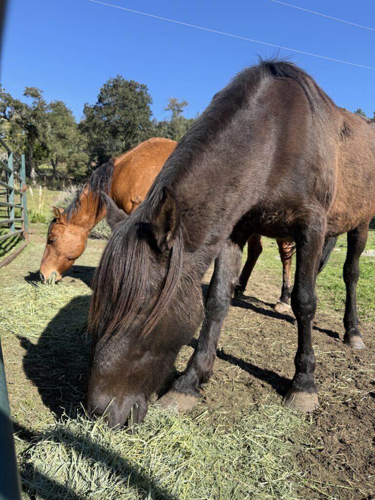 What is it doing, feeling like 75 degrees? I’ll take it! It’s an opportunity to try and get some of the snarls out of a mane, and hot-glued patches off the skin (YIKES!) I know! When horses come from neglect or feedlot situations, we never know the condition they arrive in. What is most important is letting them settle in and decompress. Are they pregnant? We think yes. But that’s not the priority right now. We are just letting them begin to believe they are safe.